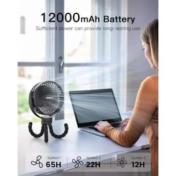 Show more Introducing the ultimate summer companion, this incredible USB rechargeable fan is not just any typical cooling device. Designed with a powerful built-in 12000mAh rechargeable battery, it boasts a mesmerizing 65-hour battery life, ensuring you stay refreshed during those sweltering days. The flexibility and practicality of this fan make it a must-have; you can easily charge it through any USB port—be it from a power bank, a PC, or a wall outlet.