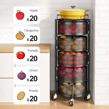 Designed to fit seamlessly into your home, the Rotating Storage Rack has a compact outline of 13.1 inches (L) x 13.1 inches (W) x 35.5 inches (H), making it suitable for any kitchen or space. The lightweight design is enhanced by 4 easy-rolling casters, including 2 locking brakes, ensuring stability while also allowing for effortless movement from room to room. Whether you need a mobile fruit and vegetable basket, a storage rack for onions and potatoes, or even an organizer for your bathroom or craft room, this rack does it all!