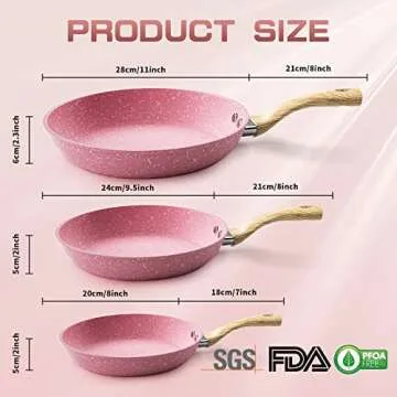 Show more This beautiful set of frying pans is not just a kitchen necessity but a stylish addition that will elevate your cooking experience! With a stunning pink speckled granite nonstick coating, you can say goodbye to toxic materials like PFOA, PFOS, and PTFE. It's designed to facilitate worry-free cooking, allowing you to use less oil while delivering remarkable food release.