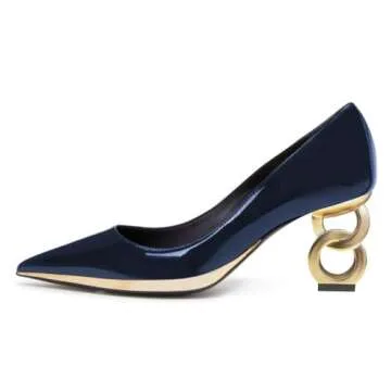 FSJ Women Classic Gold Chain Chunky Heel Pumps Pointed Toe Slip On High Heel Ladies Office Fashion Dressy Comfy Evening Shoes Size 8 Blue