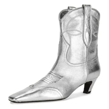 FSJ Stylish Women Square Toe Comfort Kitten Low Heel Ankle Bootie - Silver