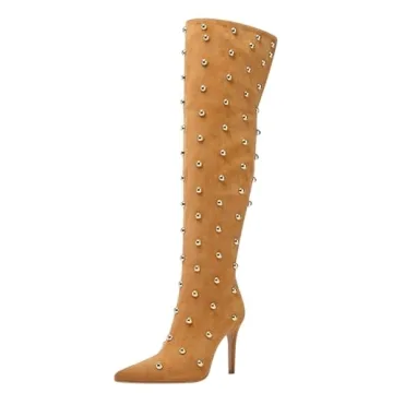 Step into the spotlight with the FSJ Women's Studded Stiletto Over the Knee Boots, a perfect blend of elegance and edge. These boots feature a high-heel measuring approx. 10-12 cm/4-4.7 inches, designed to elevate your style and confidence. Crafted from high-quality synthetic materials, they offer durability and comfort, making them ideal for everyday wear. The pointed toe, studded design, and faux suede upper add a touch of sophistication, making these boots a must-have in every fashion-forward woman's wardrobe.