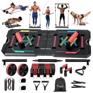 Show moreIntroducing the Fueti Foldable Push-Up Board, a versatile and multifunctional home fitness equipment system designed to elevate your workout experience. Crafted with innovative features, this fitness board enables you to engage in a variety of push-up positions with the help of color-coded handles. Each color signifies a specific muscle group, allowing you to train your chest, shoulders, triceps, and back with optimized efficiency. Additionally, this comprehensive fitness system comes equipped with essential accessories such as a pilates bar, resistance bands, AB rollers, jump ropes, handles, ankle straps, and a door anchor, ensuring you have everything you need for a full-body workout at home.