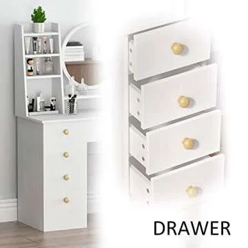 FUFU&GAGA White Vanity Set with Round Mirror, Makeup Vanity Dressing Table with 5 Drawers, Shelves, Dresser Desk and Cushioned Stool