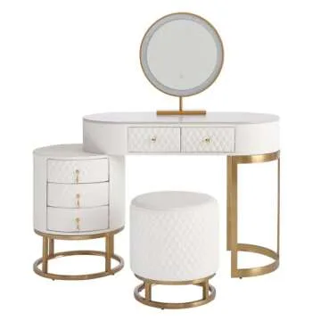 FUKAYI Faux Leather Makeup Vanity Desk Set with LED Lighted Mirror Luxury Dressing Makeup Table with Storage Drawers & Vanity Stool, White