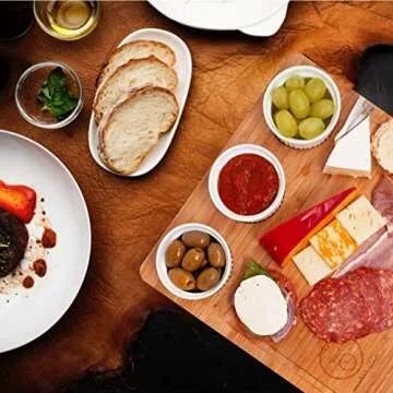 Full-Bundle Cheese Board and Food Serving Set, 13.4 Inches x13.4 Inches Bamboo Charcuterie Board with 4 Wine Coasters, 3 Ceramic Bowls, and Cutlery Set Included
