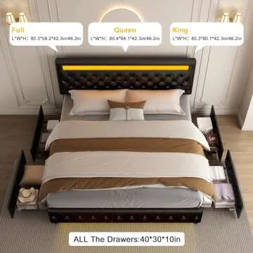 Show more Elevate your bedroom experience with this Full LED Bed Frame, designed to blend functionality with modern aesthetics. This exceptional piece not only features a chic upholstered look but also comes equipped with four spacious storage drawers to keep your space organized and clutter-free. Each drawer glides smoothly on wheels, making it effortless to store your belongings and maintain a tidy environment.