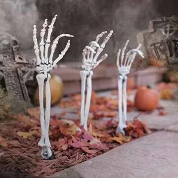 Why You Will Love This Product: These playful yet spooky skeleton hands allow you to set the tone for your Halloween festivities with ease. The combination of humor and fright is sure to enchant guests of all ages, enhancing the communal spirit of Halloween gatherings. With their whimsical design and sturdy construction, these hands are not just decorations; they're a way to bring joy, laughter, and a little spookiness to your celebrations, ensuring you create unforgettable memories year after year.