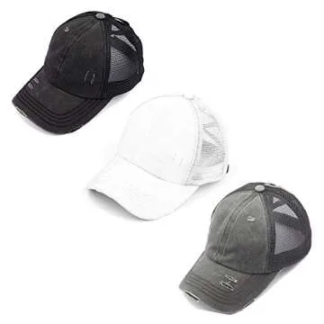 Show more Introducing the Funky Junque Women's Distressed Trucker Hat with Ponytail Hole – an essential accessory combining style and functionality. This three-pack includes classic colors: Black, White, and Grey, perfect for elevating any outfit with a trendy touch. The distressed and washed look of each hat brings a unique vintage charm, making it a must-have for fashion-forward women. Designed with elastic bands that create a ponytail hole, this cap accommodates different ponytail heights, allowing you to rock a stylish appearance while enjoying ultimate comfort.