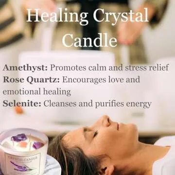 Show more Introducing the FunkyFrankie® Extra Large Healing Crystals Candle, a stunning 12 oz manifestation candle designed to elevate your spiritual practice and create a serene atmosphere. Crafted with the finest natural ingredients, this candle features three powerful healing crystals: amethyst, rose quartz, and selenite, each selected for their unique properties. The gentle glow of the candle creates a calming space, making it perfect for meditation or simply unwinding after a long day. Its chic glass jar is not only sturdy but also beautifully adorned with gemstones, enhancing the visual appeal while ensuring a long-lasting burn of 55-65 hours. Immerse yourself in tranquility with this luxurious candle that embodies both aesthetic charm and spiritual purpose.