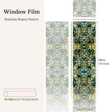 Show more Transform your ordinary windows into stunning works of art with our decorative double-sided thickened static window cling. Measuring an impressive 17.7x118 inches (45x300cm) and covering 14.5 sq.ft., this cling can be effortlessly cut to fit your specific needs. It boasts a unique and innovative design that allows the vibrant patterns to be enjoyed from both the inside and outside, making it perfect for those who appreciate beautiful aesthetics in their home. Experience a touch of elegance as it turns your transparent glass windows and doors into fashionable, translucent displays of colorful artistry, all while allowing soft, diffused light to brighten your space.