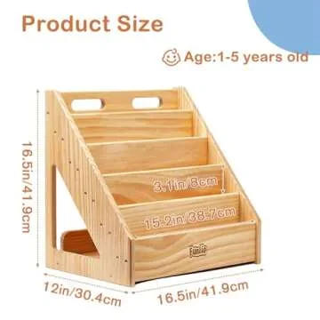 Show more Introducing the wonderful FUNLIO Montessori Bookshelf, designed to ignite your child's passion for reading. This uniquely crafted bookshelf is built with taller baffles and wider spaces, ensuring that your little ones can comfortably access their favorite books while keeping them organized in a playful and inviting manner. Made from high-quality pine wood, this bookshelf guarantees both durability and safety, making it the perfect addition to your child's reading nook.
