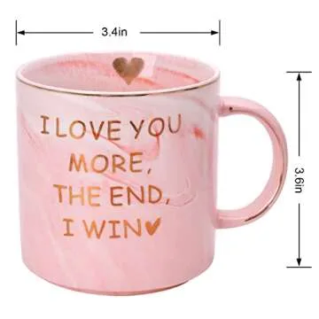 Show moreIntroducing the delightful Funny Gifts for Women and Men - an enchanting 12 oz Marble Pink Coffee Mug perfect for expressing your affection. This beautifully crafted mug showcases an eye-catching marbled pink design, making it not only a fun drinking vessel but also a stunning piece of decor for any kitchen or office. The charming phrase, I Love You More, The End, I Win is elegantly printed, adding a touch of humor and love to every sip. Ideal for coffee, tea, or your favorite hot beverage, this mug is designed for those who appreciate a blend of style and sentiment. Celebrate moments of joy and connection with this beautifully designed mug that speaks volumes about your feelings!
