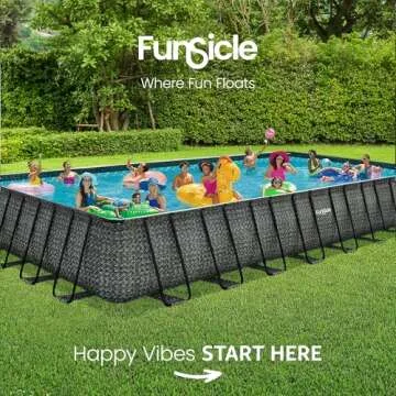 Show more Transform your backyard into a vibrant getaway with the **Funsicle Oasis Designer Outdoor Rectangular Frame Above Ground Swimming Pool Set**. Spanning an impressive **32 by 16 feet**, this stylish above-ground pool accommodates up to **15 people**, making it the perfect choice for summer parties, family gatherings, or your kids' energetic playdates. With its chic **Dark Herringbone print liner**, it adds an elegant touch to your outdoor space while providing an exciting venue for recreation and relaxation.
