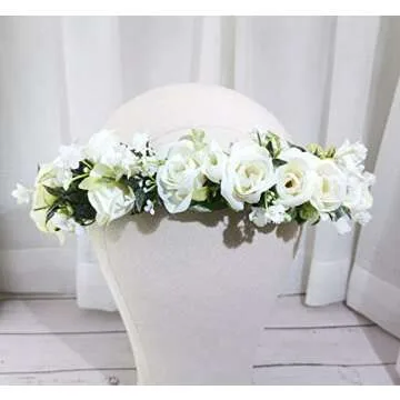 Funsveta Women Girls Boho Rose Floral Crown Wreath Wedding Flower Headband Photo Prop (Green Leaf and White)