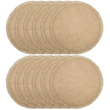 Show more Transform your dining space into a refined haven with the exquisite FunWheat Burlap Round Braided Placemats Set. Crafted from 100% natural jute, these placemats are not only visually appealing but also highly functional. Measuring at a substantial 15 inches in diameter, each mat is perfectly designed to accommodate any plate, bowl, or dish, making them essential for both daily meals and special gatherings. Whether you're hosting an elegant dinner party or a casual family lunch, these placemats bring a touch of rustic charm combined with modern durability.