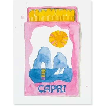 Show more Transform your living space with the eye-catching FURBISH Travel Wall Art Print - Capri Matchbook, a stunning piece that captures the essence of Italy's charm and elegance. Crafted meticulously on fine art bright white paper, this watercolor art print is designed to be an instant conversation starter. Each print is produced using an archival-grade giclée printing process, which ensures vibrant colors that pop against any background. Measuring perfectly for either a 5" x 7" frame or an 8" x 10" with a mat, it is ideal for art lovers seeking to enrich their home’s ambiance.