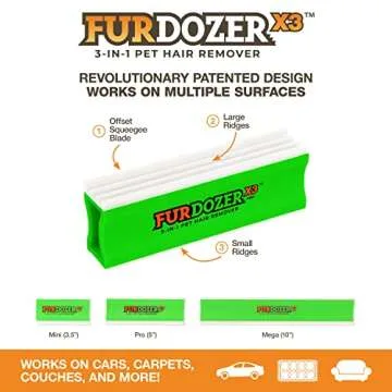 Show moreIntroducing the **FurDozer X3 PRO Pet Hair Remover & Auto Detailing Tool**, your ultimate solution for eliminating pet hair and debris from various surfaces! Expertly designed and manufactured in the USA, the FurDozer is not just a tool, but a game-changer in the world of cleaning. This versatile tool combines the power of two ridged sides and a squeegee blade, creating a compact design that’s easy to handle yet incredibly effective. Whether you’re dealing with stubborn pet hair embedded in carpets or lint on your favorite couch, the FurDozer is your go-to weapon. With a size of 5 inches, it’s tailored to be the perfect balance for everyday use at home or on the road.
