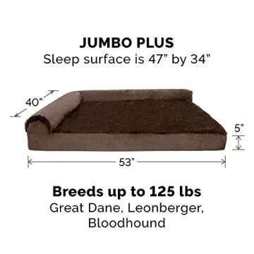 Show more Introducing the **Furhaven Orthopedic Dog Bed**, expertly designed for large dogs up to 125 lbs who deserve the ultimate in comfort and support. Crafted with a plush L shaped chaise design, this bed creates a cozy and inviting space that promotes relaxation and security for your furry friend. The thoughtful design includes supportive bolsters that provide the perfect resting spot for your dog’s head, ensuring optimum lounging comfort. With its vibrant Sable Brown color, this stylish dog bed will enhance any living space while delivering unmatched coziness.
