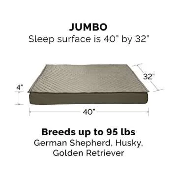 Show moreIntroducing the **Furhaven Water-Resistant Memory Foam Dog Bed**, the ultimate sleeping solution for your furry companions that combines both comfort and practicality. Crafted with a luxurious quilted top panel that easily zips off for cleaning, this bed is designed to provide your pets with the utmost coziness and support. Its **memory foam** top conforms to their body, alleviating pressure points and providing necessary joint support for a restful night's sleep. With a generous **Jumbo size** suited for large dogs up to 95 lbs, it offers ample space for lounging both indoors and outdoors. The chic Dark Sage color adds a stylish touch to your home decor, while its **water-resistant** body protects against spills and accidents, making it a smart choice for pets of all ages.