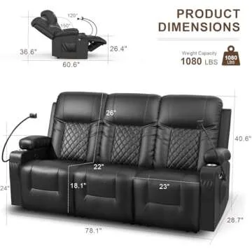 FURNIMAT Recliner Sofa, Reclining Sofa 3 Seats Dual Recliner, PU Leather Recliner Couch, Modern Recliner Chair for Living Room, with Cup Holder and 2 Cell Phone Holder, USB Ports, Black