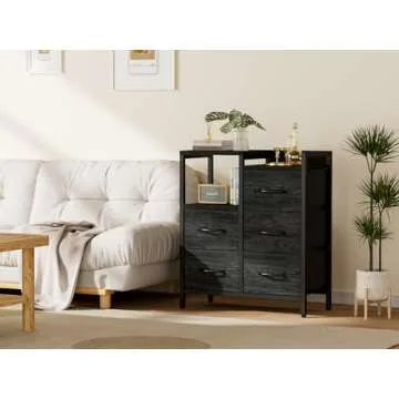 Furnulem 5 Drawer Black Dressers for Bedroom 2 Tier Shelf Storage Small Fabric Dresser for Closet Sturdy Metal Frame Modern Style Storage Cabinets Organization Units for Hallway Rooms