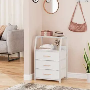 Furnulem White Nightstand with 3 Drawers and 2-Tier Shelf, Small Night Stand End Table Side Furniture, Fabric Storage Organizer for Bedroom, Closet, Hallway, Nursery, Sturdy Steel Frame, Wood Top