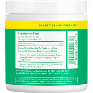 Show moreIntroducing **Further Food Premium Matcha Green Tea Powder**, an extraordinary superfood blend designed to revitalize your mind and body. Sourced from the lush hills of Japan, this 100% USDA Organic matcha powder is more than just a tea; it’s a powerhouse of vitality. With each serving, you embrace a holistic approach to wellness by integrating **matcha green tea**, along with **ashwagandha**, **ginger**, **wheatgrass**, and **cordyceps** into your routine. This unique combination not only promotes enhanced cognitive function and energy but also fights fatigue and stress, making it the ideal companion for your busy lifestyle.