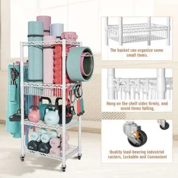 FUTASSI S1 Home Gym Storage, 3-Tier Workout Equipment Organizer with Wheels for Yoga Mats, Foam Roller, Dumbbells, Kettlebells, and Resistance Bands, 47.4" H x 27.5" W x 11.8" D, White