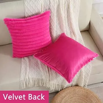 FUTEI Hot Pink Striped Decorative Throw Pillow Covers 18x18 Inch Set of 2,Square Spring Decorations Couch Pillow Case,Soft Cozy Faux Rabbit Fur & Velvet Back,Modern Home Decor for Bed