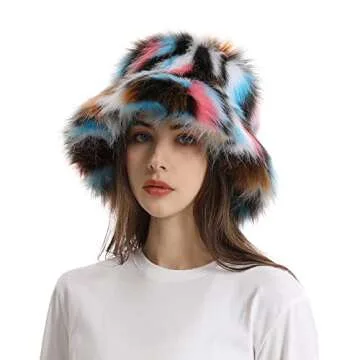 Fuzzy Bucket Hat for Women Winter Fluffy Furry Plush Faux Fur Hats Rainbow Cute Women's Bucket Hats