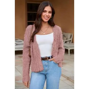 Fuzzy Cardigans for Women Open Front V-Neck Button Down Outwear Coats Sweater Pink S