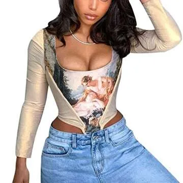 Show more Introducing the Fyclemt Women Push Up Bustiers Corsets - a fabulous combination of modern style and classic design! This trendy crop top mimics the iconic Vivienne Westwood corset, delivering a chic look that’s perfect for any occasion. Made from premium quality polyester and spandex, it promises a breathable, soft, and skin-friendly experience. Its fashionable sleeveless design highlights your shoulders beautifully, while the striking angel print and square collar add a touch of elegance and sensuality to your outfit.