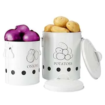 Show more Introducing the exquisite G.a HOMEFAVOR Set of 2 Antique Cream Vintage Potato Onion Kitchen Storage Canisters, the perfect blend of style and functionality for any kitchen! Made from high-quality powder-coated sheet steel, these charming metal containers are designed to keep your potatoes, onions, garlic, and other produce fresh while adding a touch of vintage elegance to your culinary space. With their robust construction, these canisters not only protect your staples but also enhance the aesthetic appeal of your kitchen.