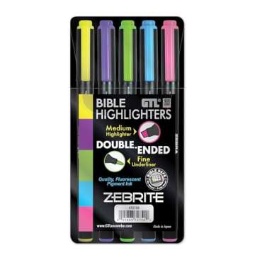 G.T. Luscombe Company, Inc. Zebrite Double Ended Bible Highlighters | No Bleed Pigmented Ink, No Fading or Smearing | Double Ended Fluorescent Multicolor for Highlighting & Underlining (Set of 5)