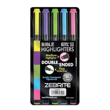 Show more Discover the vibrant world of highlighting with the G.T. Luscombe Company, Inc. Zebrite Double Ended Bible Highlighters. Crafted specifically for delicate pages, these highlighters feature no bleed pigmented ink that leaps off the page without transferring to the other side, making them perfect for Bibles, legal books, journals, and textbooks. With a thoughtful blend of five stunning neon colors—yellow, violet, blue, green, and pink—this set caters to all your highlighting needs and elevates your reading experience.