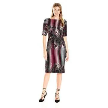 Gabby Skye Women's Elbow Sleeve Round Neck Midi Scuba Sheath Dress, Black/Multi, 4