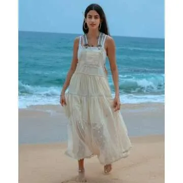 Show more Experience the charm and elegance of summer with our stunning Bohemian Dresses, meticulously crafted by GACAKY. These dresses are made from a breathable blend of Cotton and Polyester, ensuring you stay comfortable even on the hottest days. The creative design features a loose fit and adjustable contrast brace straps, complemented beautifully by a functional bib pocket. The scalloped lace trimming and embroidered flowers add a unique touch, giving it a retro-inspired flair that is truly eye-catching.