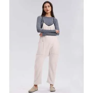 Gacaky Womens Fleece Overalls Loose Fit Adjustable Strap Fleece Jumpsuits Rompers Fall Winter Warm Fashion Work Outfits with Pocket Beige L