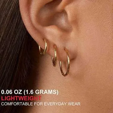 Show moreIntroducing the Gacimy Small Gold Hoop Earrings, a perfect blend of elegance and comfort designed for the modern woman. Made from high-quality 14K gold plating over a sturdy 925 sterling silver post, these hoop earrings are not only beautiful but also hypoallergenic, making them ideal for sensitive ears. Their light weight, at less than 0.06 oz, means you can wear them all day without discomfort—perfect for both active days and elegant nights out.