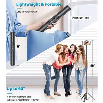- Rechargeable Remote Control: The tripod includes a long-lasting rechargeable remote that works within a 10-meter range, making group selfies or videos effortless.
