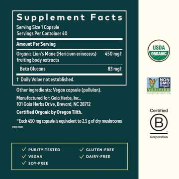 Gaia Herbs, Lions Mane Mushroom, 40 Count