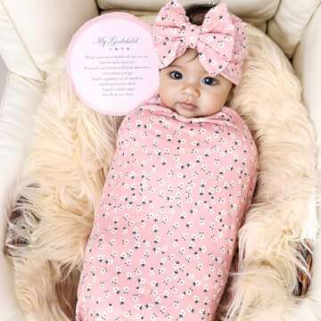 Show moreWrap your little princess in comfort and style with the Galabloomer Receiving Blanket Headband Set. Crafted from a super soft and stretchy knit fabric, this beautiful blanket is perfect for your baby girl, ensuring warmth without the risk of overheating. Its design features rounded edges and a delicate flower print, capturing the essence of sweetness and elegance. Specifically tailored for infants, this receiving blanket is devoid of any zippers or snaps, guaranteeing a safe and cozy experience for your baby. Lightweight and breathable, the blanket makes it an ideal choice for warmer summer months, making sure your little one stays comfortable all day long.