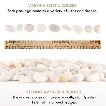 Show more Transform your living spaces into a serene oasis with the Galashield White River Rocks. This exquisite selection of polished gravel offers a versatile solution for enhancing both indoor and outdoor environments. Ideal for use in flower arrangements, as vase fillers, or to accentuate the beauty of your aquarium, these natural stones are designed to elevate your décor while providing a touch of elegance. Each 5 lb bag contains approximately 130 smooth stones ranging from 2-4 cm (0.8-1.6 inches), beautifully refined and perfect for any decorative purpose, be it for a cozy candle display or as a stylish mantlepiece accent.