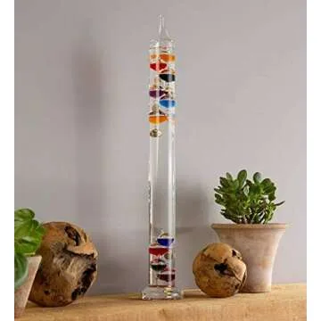 Show moreIntroducing the exquisite Galileo Glass Thermometer, a perfect fusion of science and art designed to grace your home or office decor. Towering at 20 inches, this elegant thermometer stands tall in a mesmerizing blown glass cylinder, showcasing a vibrant array of colorful glass balls that dance gracefully with each fluctuation in temperature. Developed based on the ingenious theories of Galileo, this stunning piece not only serves a practical purpose but also acts as a captivating conversation starter in any setting. Each glass bulb gently rises and falls inside the liquid-filled cylinder, giving you an interactive aesthetic that elevates your interior styling.