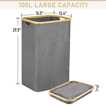 Show moreMeet the Gallelife Large Laundry Hamper, your new best friend in the battle against laundry clutter. This stylish and spacious hamper holds an impressive 105 liters of laundry, making it ideal for families or individuals who gather a mountain of clothes! Measuring 19.7 inches long x 17.7 inches wide x 28.3 inches high, its tall and slender shape means it fits perfectly in narrow spaces, whether it's placed in your bedroom, laundry room, or bathroom. Designed thoughtfully, this hamper is not just functional but also enhances your decor with its modern gray fabric and eco-friendly bamboo handles.