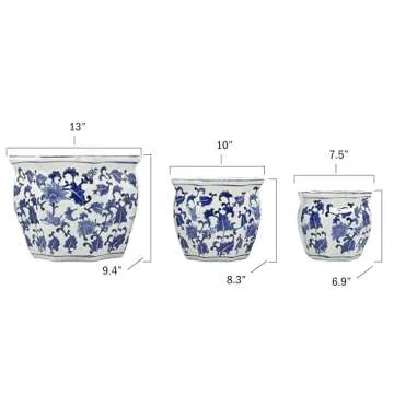 Galt International Blue & White Round Fluted Floral Porcelain Ceramic Plant Flower Planter Pot Set of 3 (7.5", 10", 13") Garden Pots Chinese Asian Design