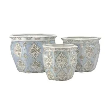 Galt International Light Blue & White Round Fluted Floral Porcelain Ceramic Plant Flower Planter Pot Set of 3 (7.5", 10", 13") Garden Pots Chinese Asian Design