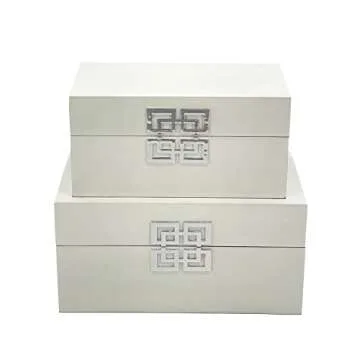 Show moreIntroducing the Galt International Storage Box Set, a stunning addition to your home organization that combines elegance and functionality in one perfect package. This exquisite duo of decorative storage boxes, crafted from premium-quality materials, showcases a classic design that makes them not just a storage solution but a true decorative piece. Their white bodies contrast beautifully with silver geometric clasps, ensuring that they will enhance any decor style in your living space, while providing a stylish way to organize your belongings. These boxes are designed to elevate your home, allowing you to declutter without sacrificing aesthetic appeal.