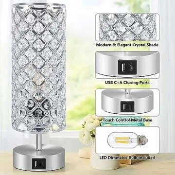 Ganiude Touch Control Crystal Table Lamps Set of 2, Nightstand Sliver Lamps with USB C+A Charging Ports, Modern Dimmable Desk Lamps for Teen Girls' Bedrooms (LED Bulb Included)